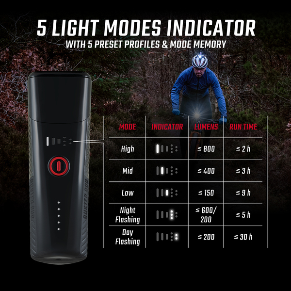 A High üzemmódtól a nappali villogó üzemmódig a BUSTER 800 rengeteg lehetőséget kínál a sötétben való tekeréshez. Az üzemmódkijelző biztosítja a maximálisan egyszerű használatot. Mindig láthatja, hogy az öt üzemmód közül éppen melyiket és milyen fényerősséggel használja.