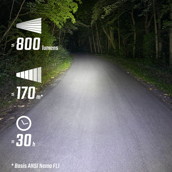 Fény a sötét ösvényeken! A BUSTER 800 azt jelenti, hogy semmi sem tarthatja vissza az éjszakai kalandoktól. A 800 lumen fényereje 170 méteres hatótávolságot biztosít - elegendő teljesítményt még a sötét erdei ösvényeken is. Öt különböző fénymód biztosítja a rugalmasságot a fényerő és az akkumulátor élettartama tekintetében. A tetején található LED-es kijelzőknek köszönhetően mindig szemmel tarthatja az aktuális beállításokat és a hátralévő akkumulátor-üzemidőt. Öt előre beállított üzemmódprofil biztosítja a könnyebb használatot. A környezetbarát lítium-ion akkumulátor a világítási módtól függően akár 30 órán keresztül is tud működni.